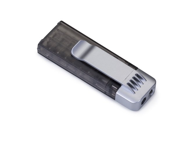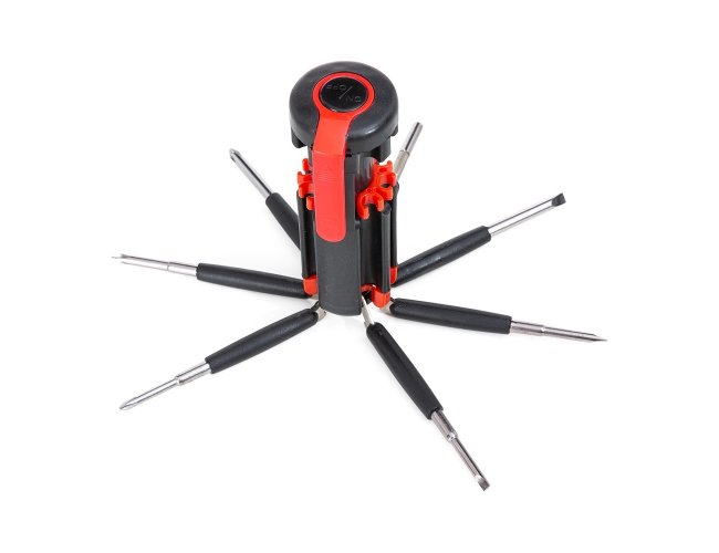 Kit ferramenta 9 peças de plástico resistente. Corpo prateado e verso com clip, há dois suportes para encaixar chaves na parte plástica preta. Para abrir o kit basta rotacionar o compartimento preto, acompanha 4 pontas de chaves Philips, 2 pontas de chave fenda, adaptador chave fenda, ferramenta auxiliar e adaptador chave Philips.
